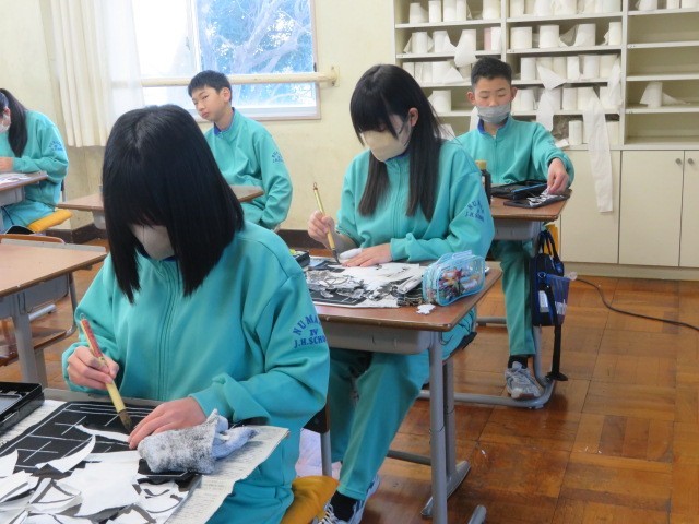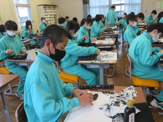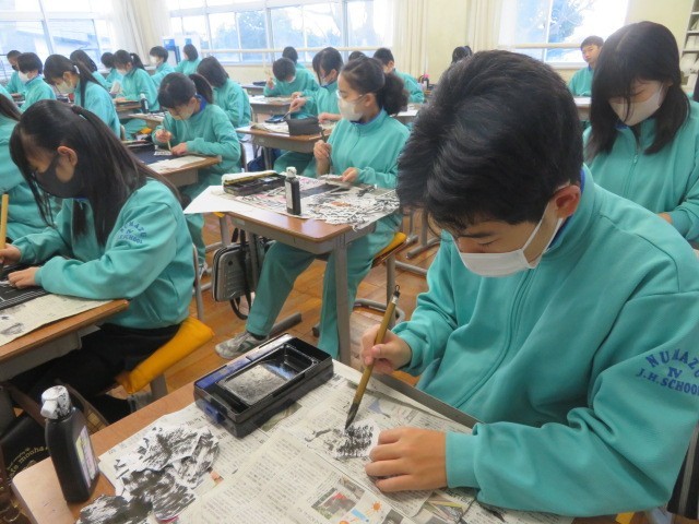 1年A組の美術の時間です。墨絵に取り組んでいます。仕上がりが楽しみです。