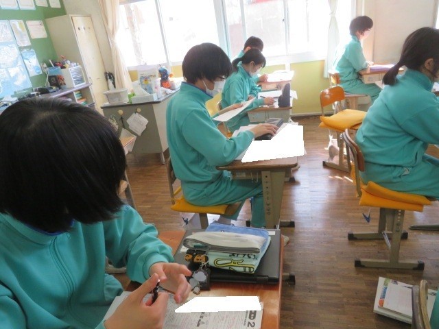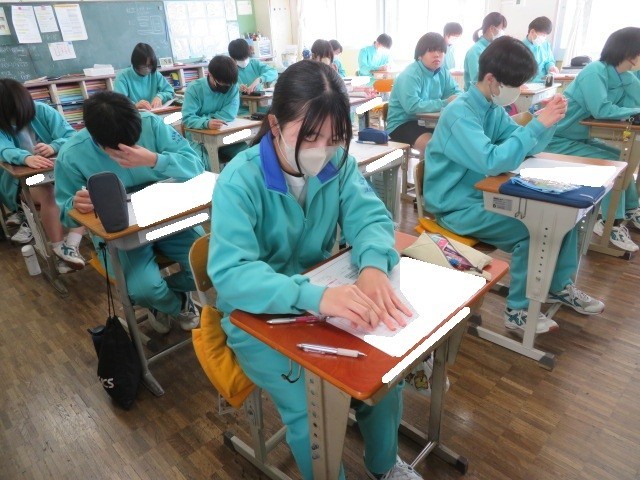 3年B組の社会の時間です。問題演習に取り組んでいます。答え合わせの中、先生から出される質問にも答えることで復習を重ねます。