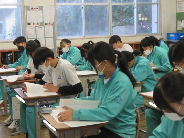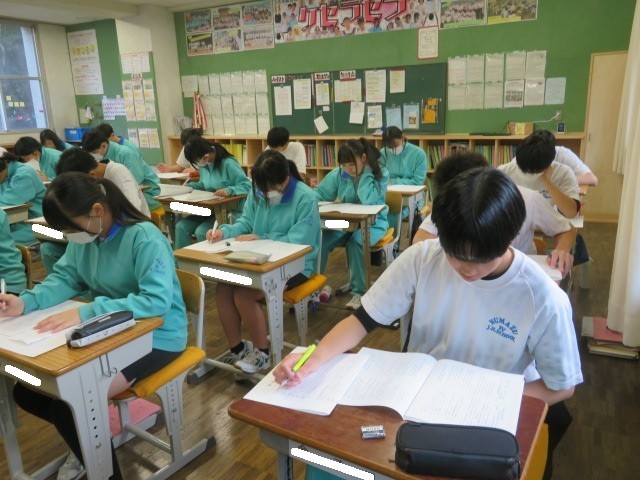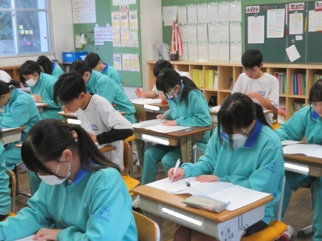 3年A組の国語の時間です。実力テスト問題に取り組んでいます。
