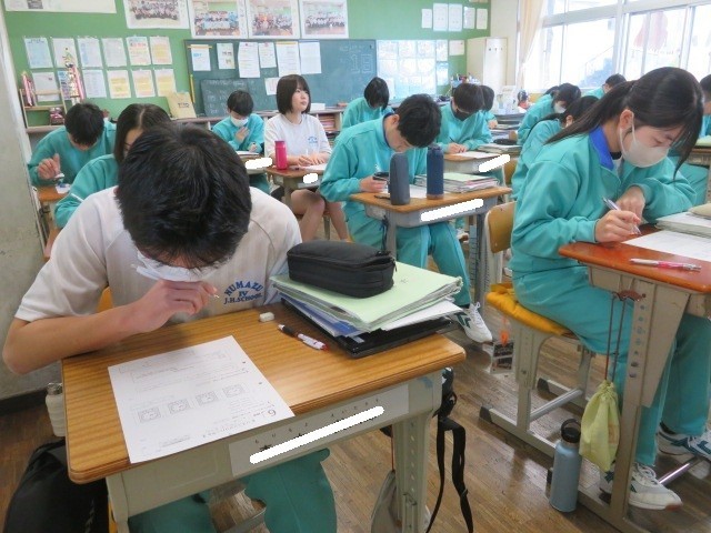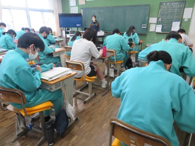 3年B組の英語の時間です。「リスニング・リハーサル」を行っています。