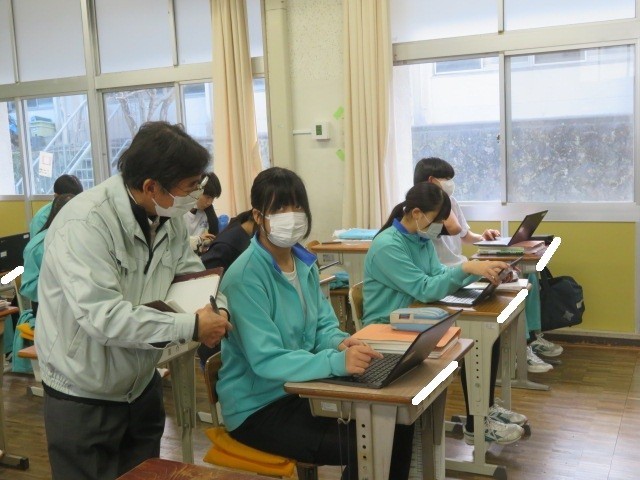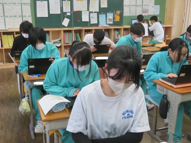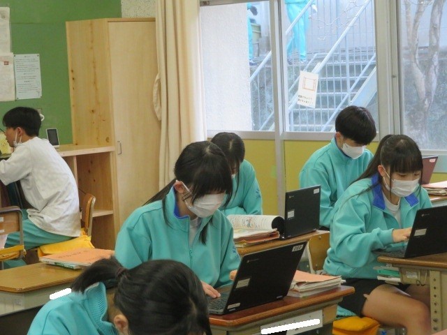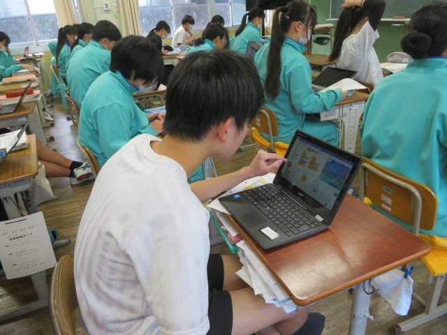 3年A組の技術の時間です。プログラミング学習を行っています。背景を考え、プログラムしてキャラクターを動かします。
