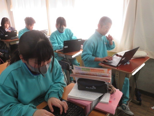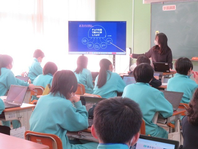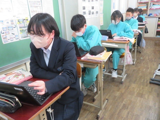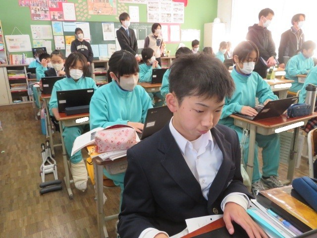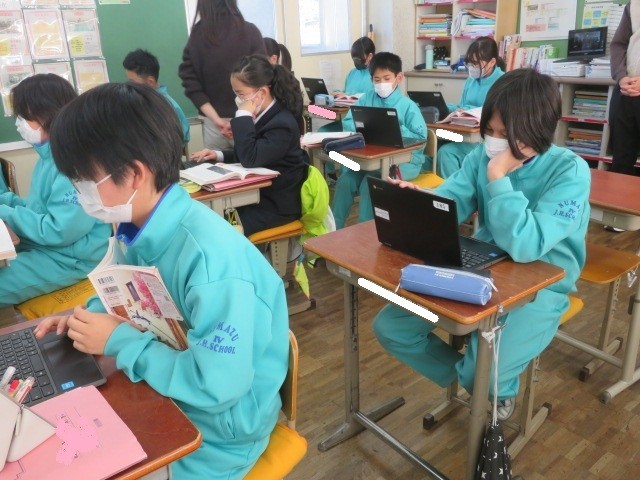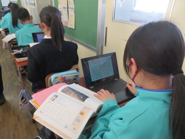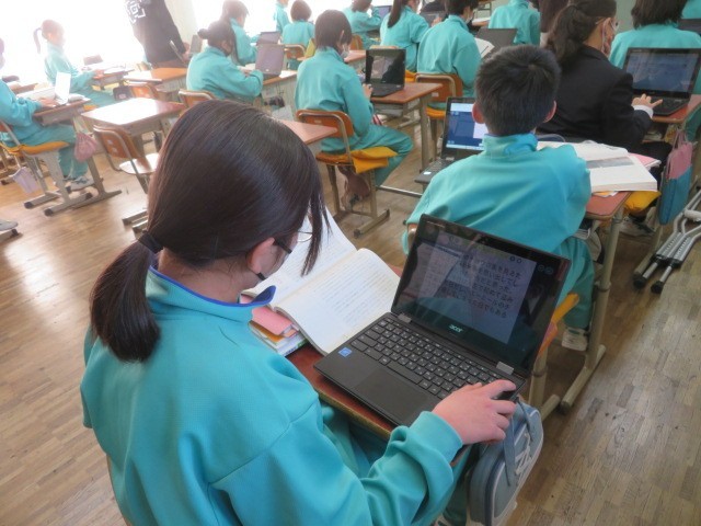 1年A組の社会の時間です。「少年の日の思い出」、僕とエーミールの心情の移り変わりに迫っていきます。ロイロノートで情報を共有しています。