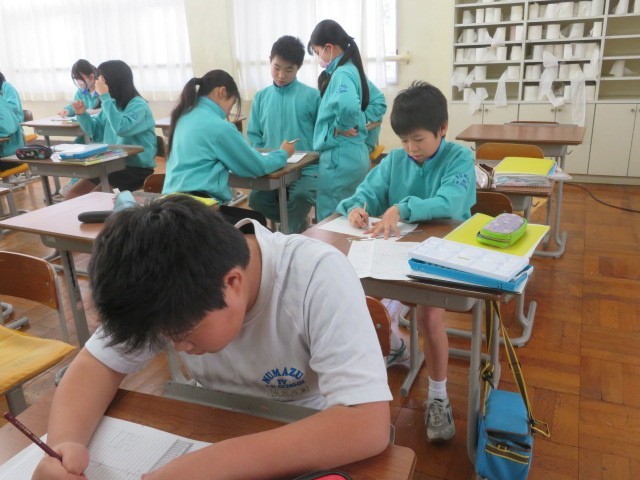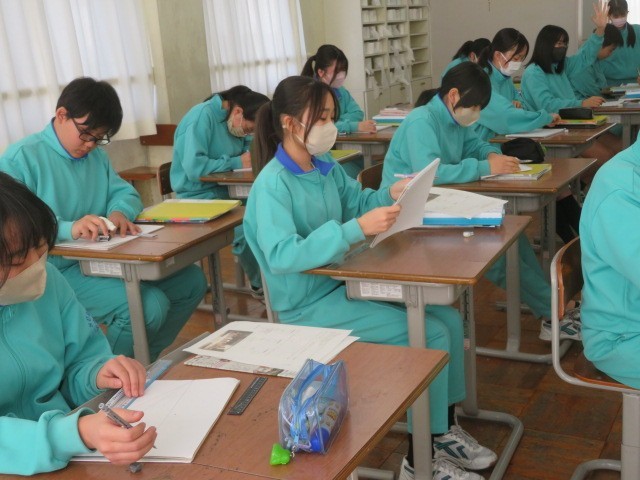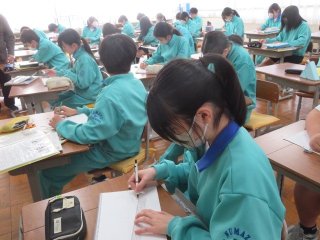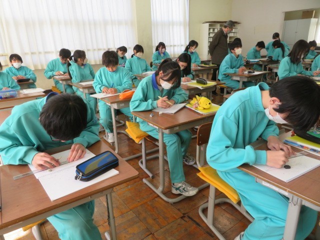 1年B組の美術の時間です。一点透視図法、二点透視図法、三点透視図法を学習し、自分で描いていきます。消失点の考え方を身につけます。