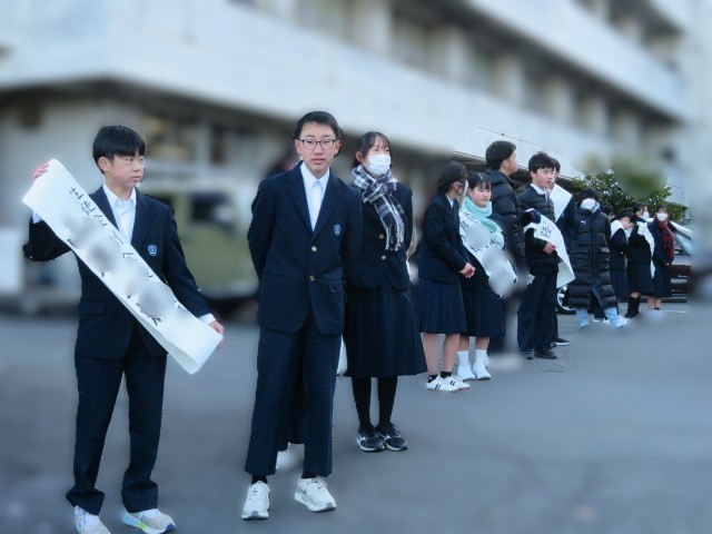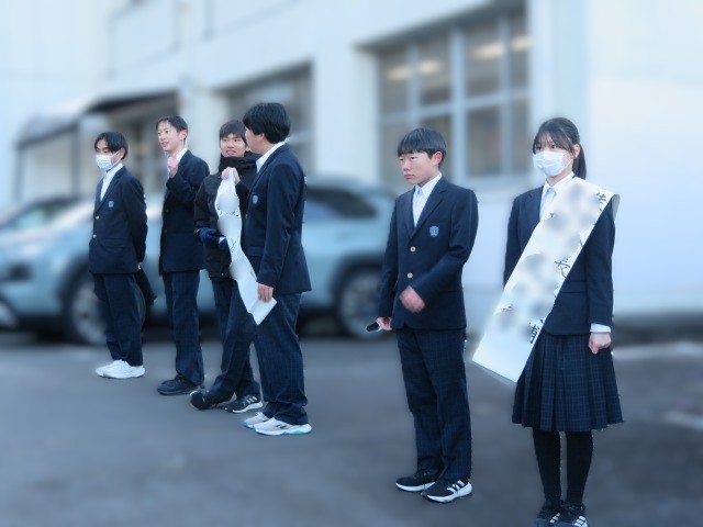 令和8年度生徒会役員選挙を控え、立候補者が朝の活動をスタートさせました。今朝は、雪も残るこの冬一番の冷え込みの中ですが、登校する生徒の皆さんに元気よく声をかけていました。