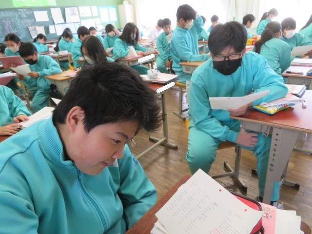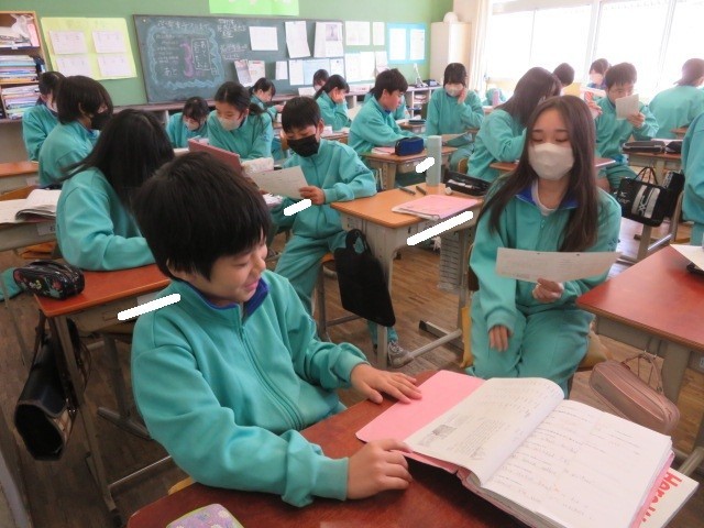 1年A組の英語の時間です。外国の友人からもらった手紙に返事を書く状況を想定して考えていきます。