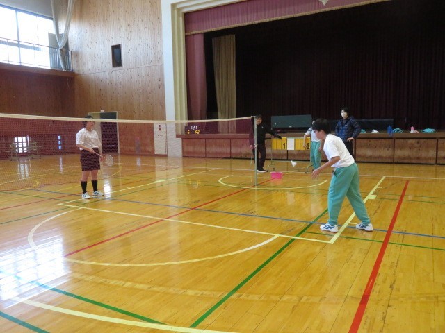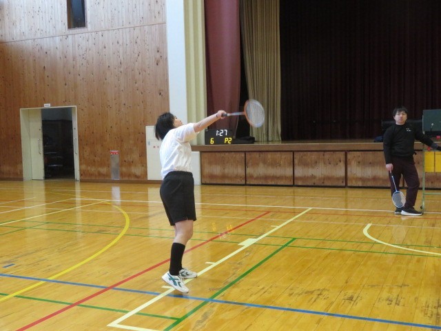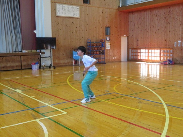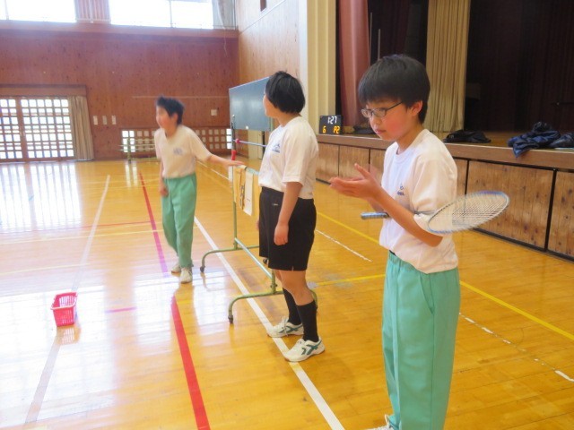 E組の体育の時間です。今日は、バドミントンに取り組みました。リズムを取りながら、シャトルを丁寧に変え打ち返していきます。