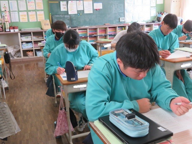 3年B組の英語の時間です。長文問題にも取り組んでいます。英語の長文問題とはこれから何度も向かい合う人も多いですね。
