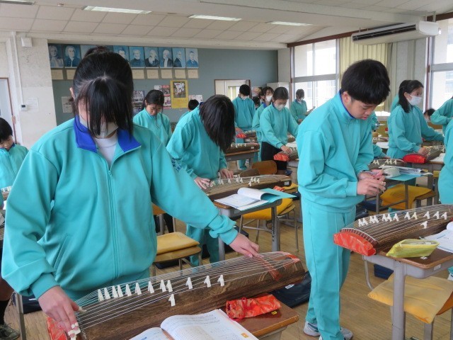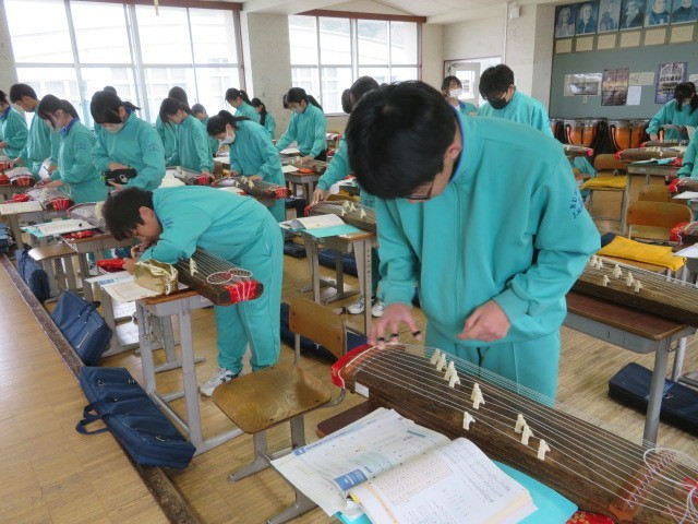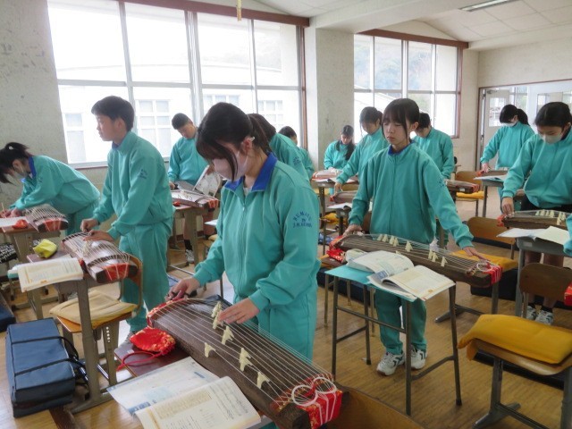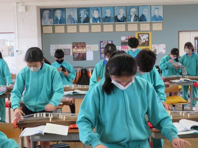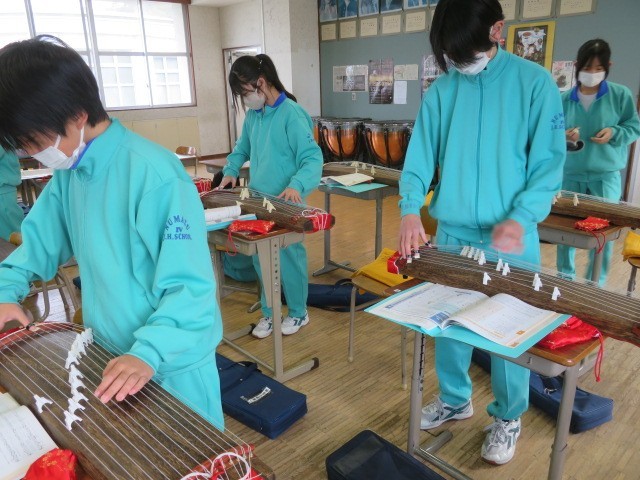 1年B組の音楽の時間です。琴の学習、それぞれに個人練習に取り組んでいます。