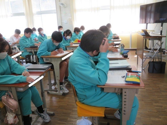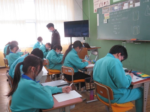 1年B組の数学の時間です。様々な錐体の体積を求めていく方法を考えています。