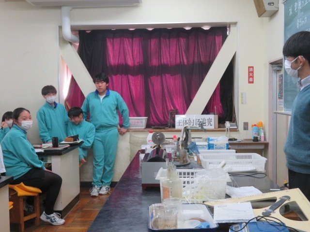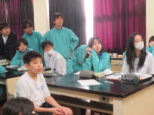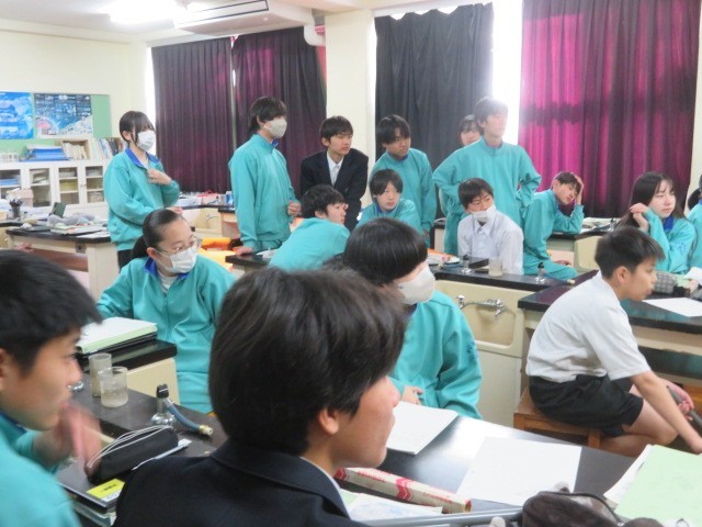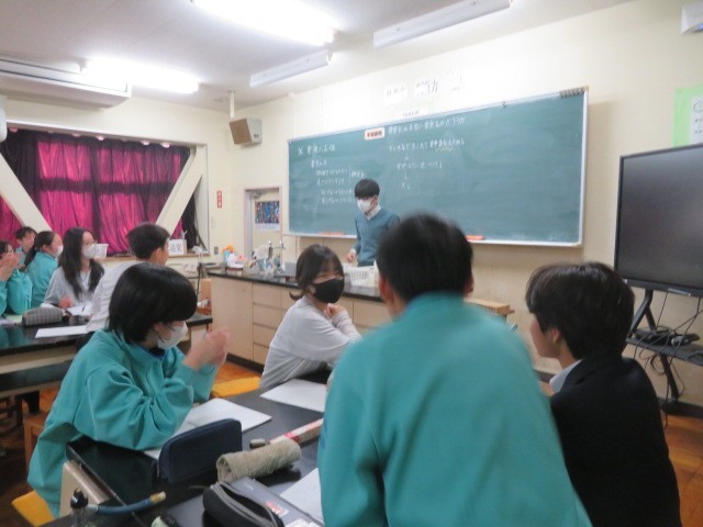 2年B組の理科の時間です。『電流の正体』についてせまります。身近な静電気を用いて確認をした後、実験器具を使っての範示の音に少しびっくりしたようです。