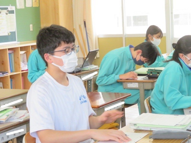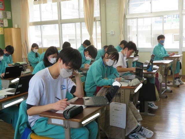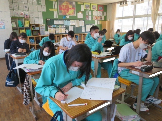 3年C組の英語の時間です。英文レターの下書きに取り組んでいます。