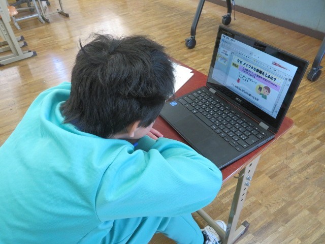 E組の道徳の時間です。映像教材を見て、自分の考えをまとめていきます。