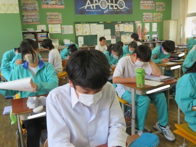 2年A組の数学の時間です。確率の練習問題に取り組んでいました。2つのサイコロの特定の和が出る確率などを求めていました。