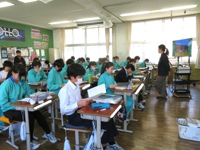 2年A組の英語の時間です。自分の好きな小説や映画、歌などの紹介文を作っています。とてもわかりやすく考えられています。