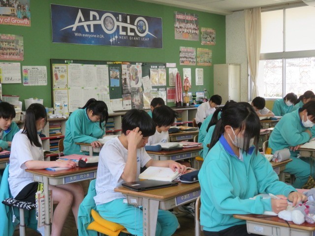 2年A組の国語の時間です。『創作』に挑戦。いろいろな例を聞きながら考えていきます。