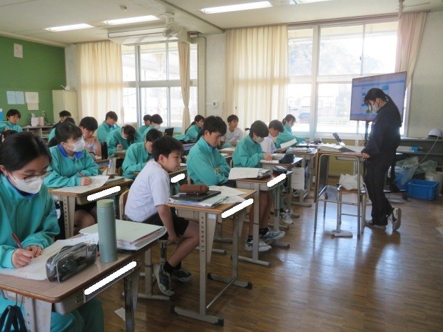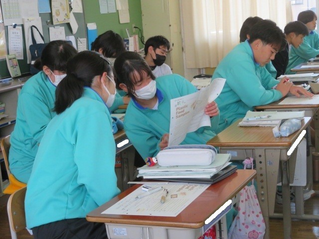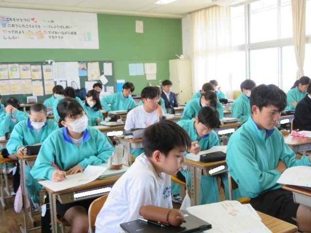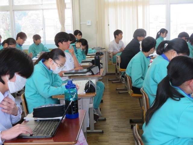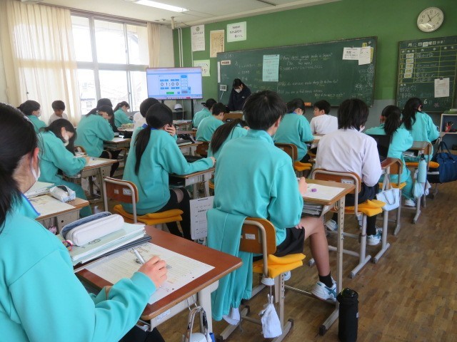 2年B組の英語の時間です。先生の解説に耳を傾けた後、ペアでリーディングを行っています。
