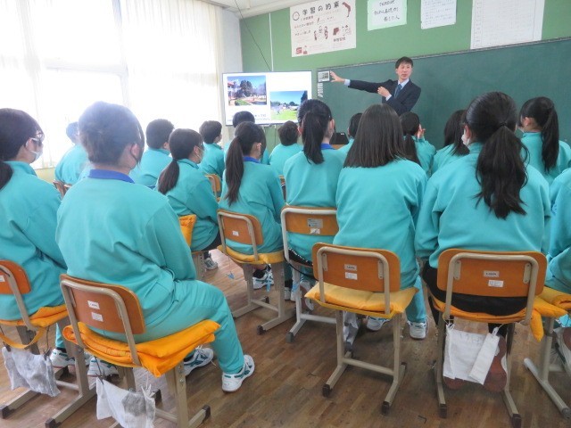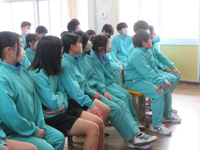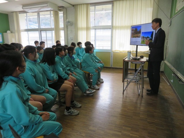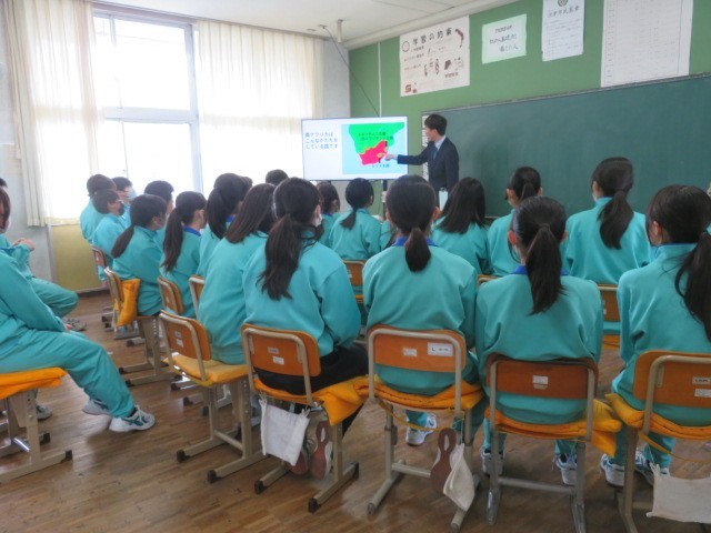 1年B組の道徳の時間です。「国際理解・国際貢献」について、世界の中の日本人としての自覚をもち,他国を尊重し,国際的視野に立って,世界の平和と人類の発展に寄与することを考えていく中で、かつて南アフリカの日本人学校に勤務されていた教頭先生のお話に耳を傾けていました。