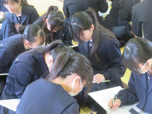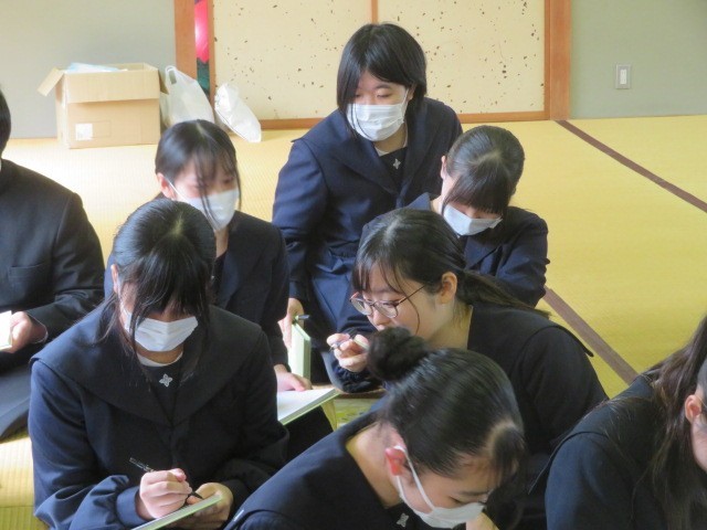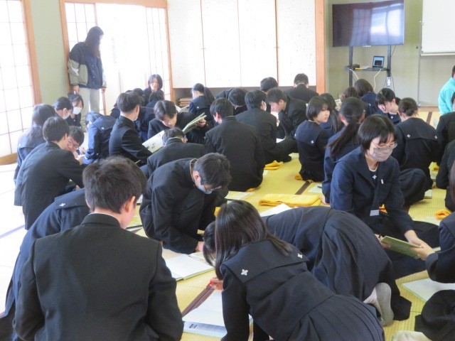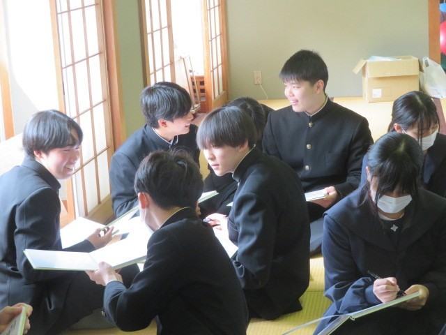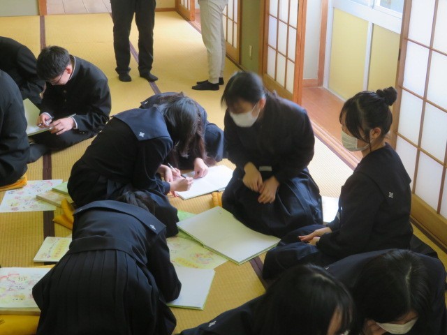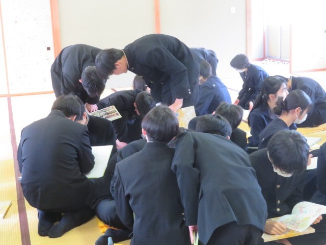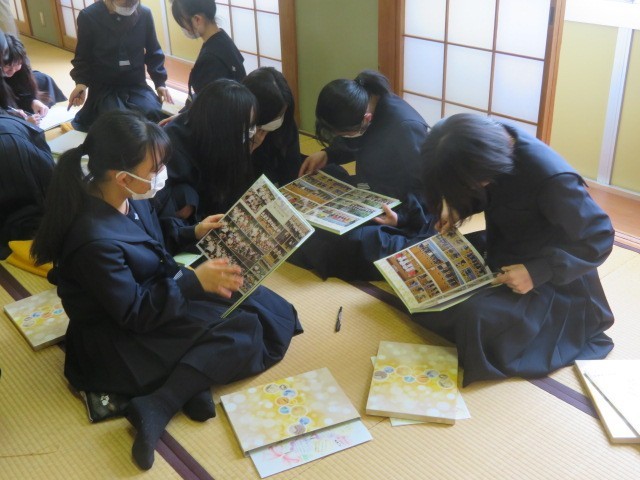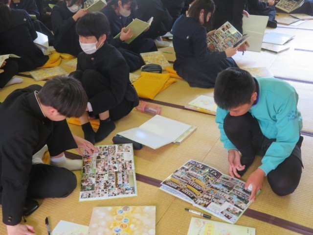 3年生が和室に集まり卒業アルバムに目を通しています。3年間の思い出を振り返りながら、メッセージの交換も行っています。