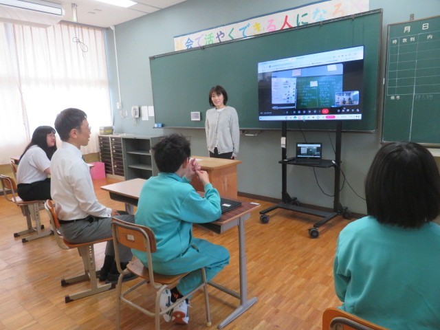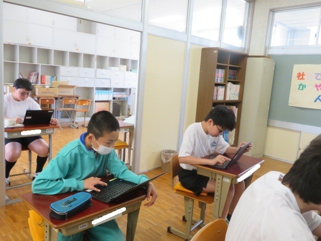 E組では、今年新しく授業に来ていただく先生の自己紹介に耳を傾けたり、タブレットで調べたりしていました。