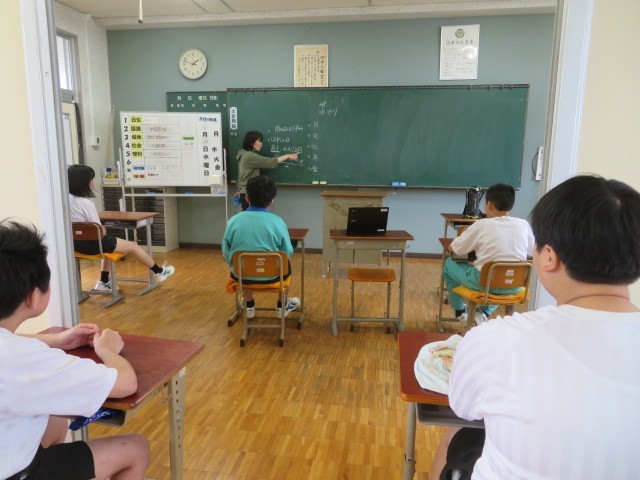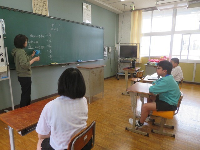 E組の理科の時間です。植物の水やりの時間について、時間帯と理由について先生の説明を聞いています。