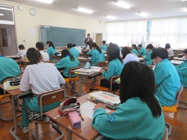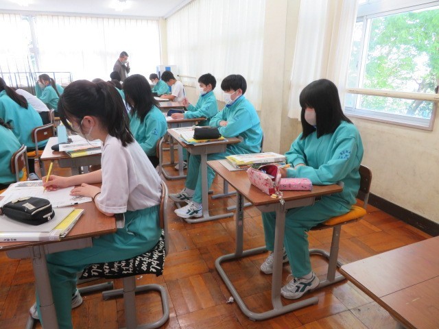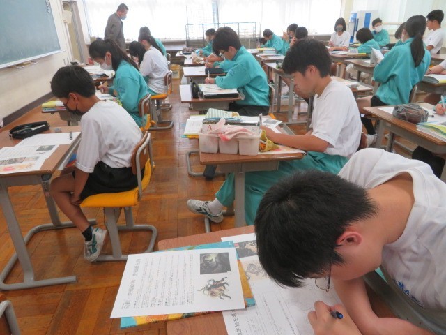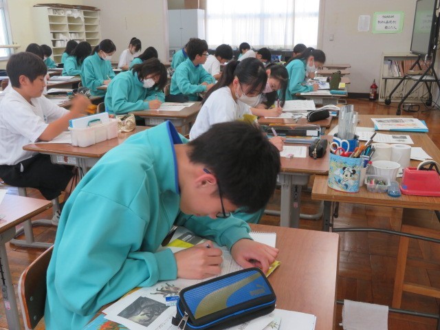 2年B組の美術の時間です。空想の動物、微生物をイメージして表しています。恐ろしい姿ばかりでなくかわいらしい姿を描いている人もいました。
