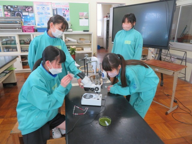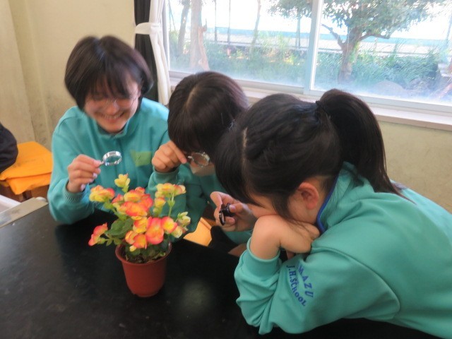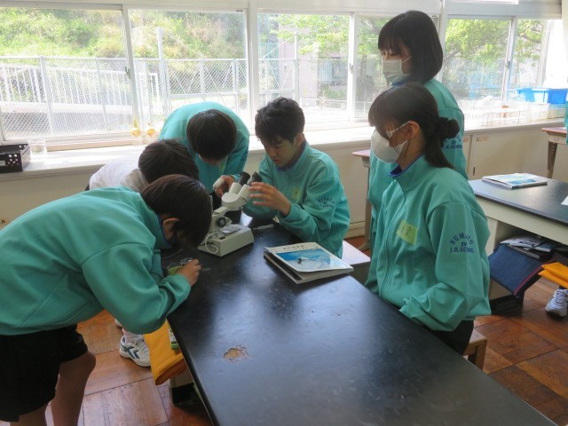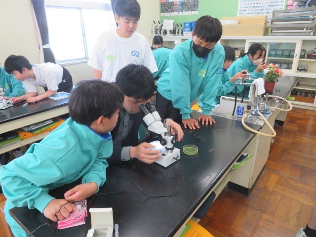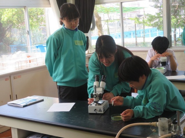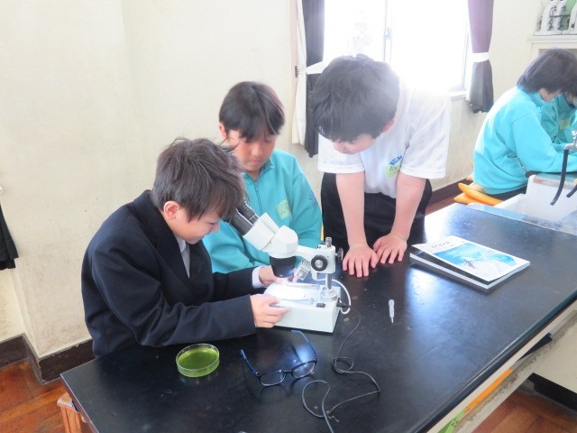 1年A組の理科の時間です。顕微鏡やルーペを使って観察を行っています。