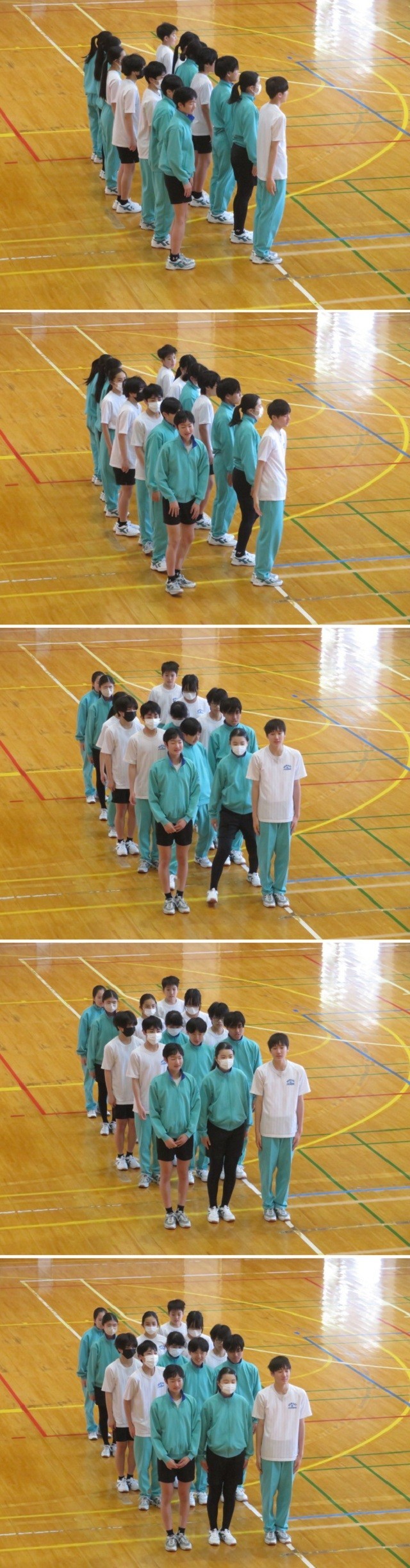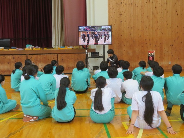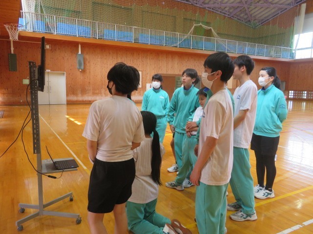 3年A組の保健体育の時間です。集団行動を2つのグループに分かれ練習しています。お手本となる映像では、やすめの後以外は気をつけの号令がかからず、常に「気をつけ」の姿勢を保っていました。3年生も頑張っています。