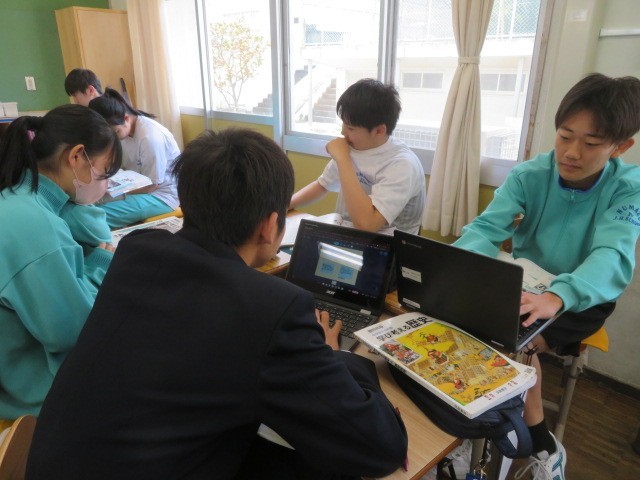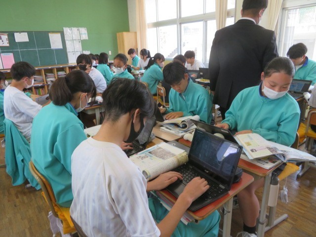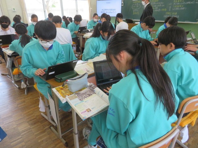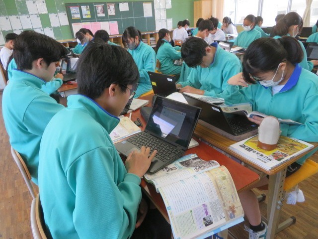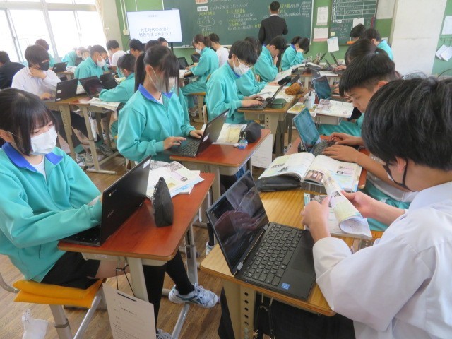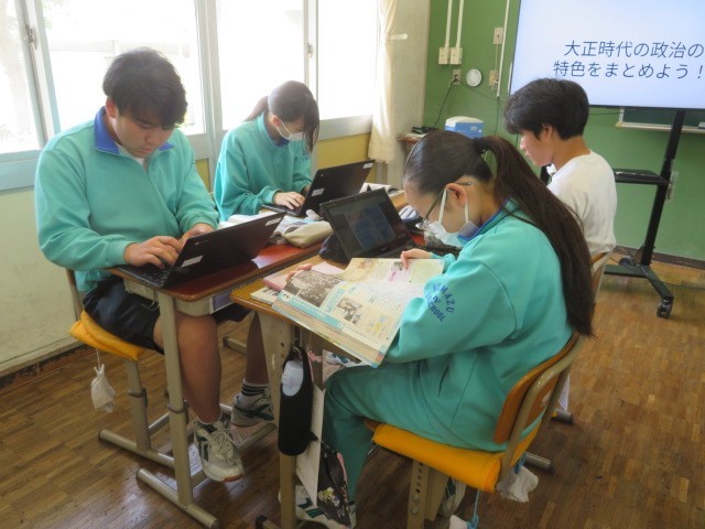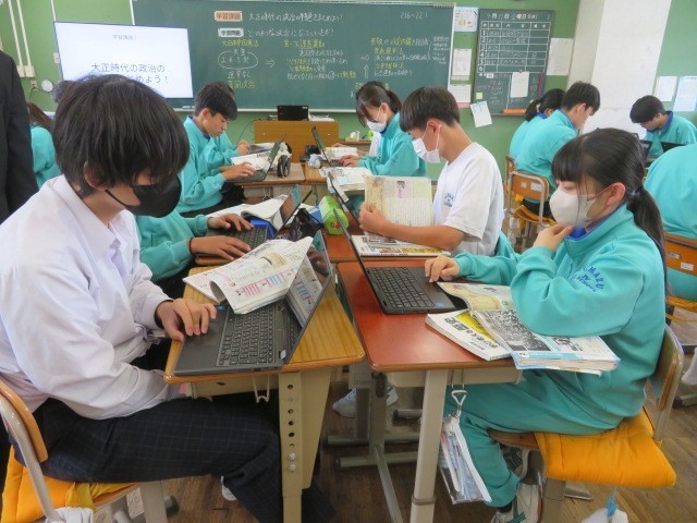3年B組の社会の時間です。「民本主義」と「民主主義」、米騒動など大正時代の日本の様子について学習を進めています。