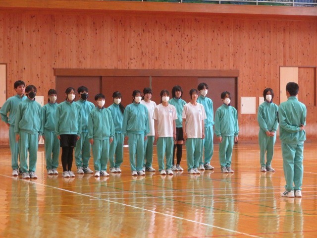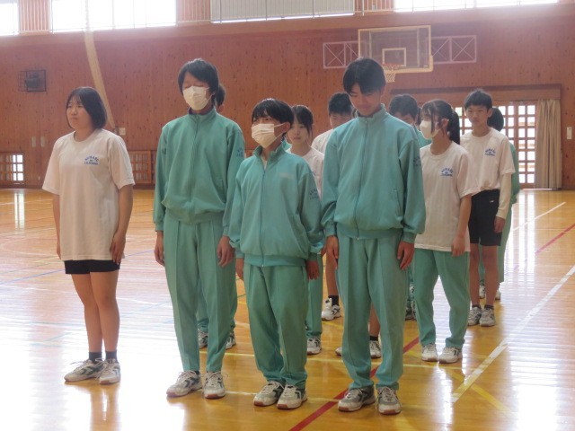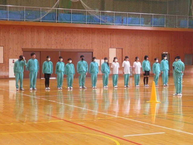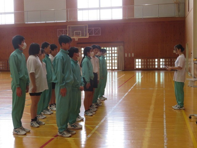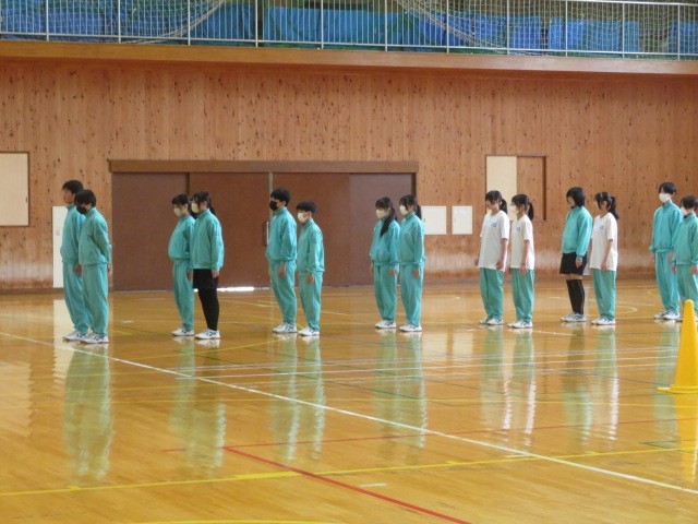 2年A組の保健体育の時間です。集団行動、リーダーの指示に従って行動します。声と動きをそろえる難しさに挑戦です。