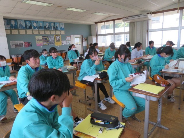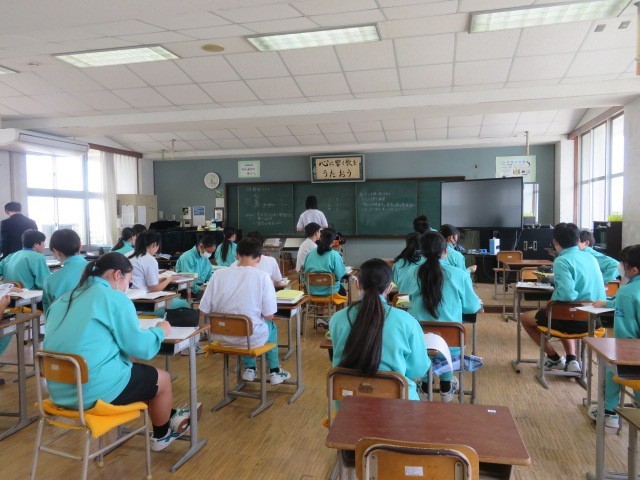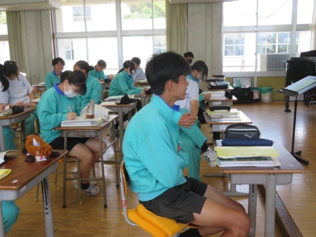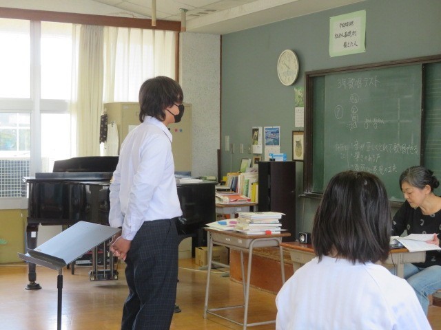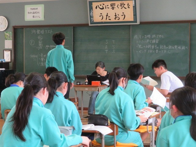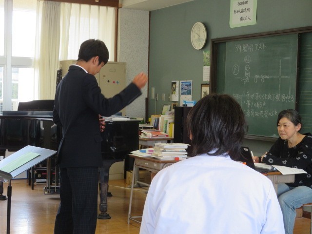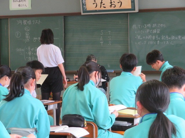 3年B組の音楽の時間です。歌唱テストを行っていました。合唱を伝統とする第四中学校の3年生らしく、上手に歌い上げていました。
