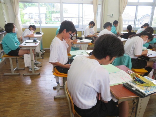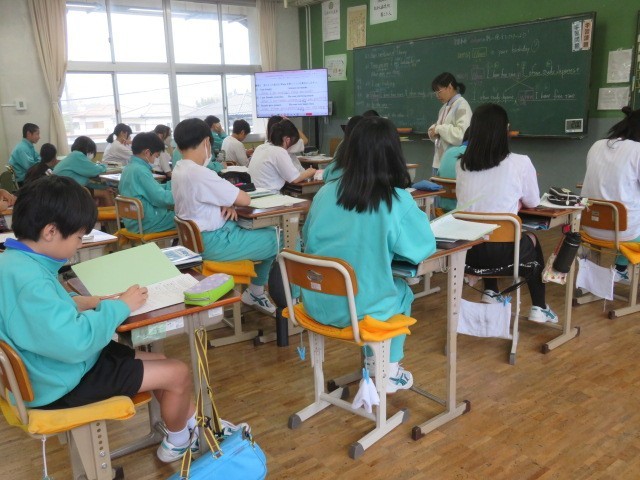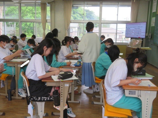2年B組の英語の時間です。接続詞「When」を使った文章を作成しています。