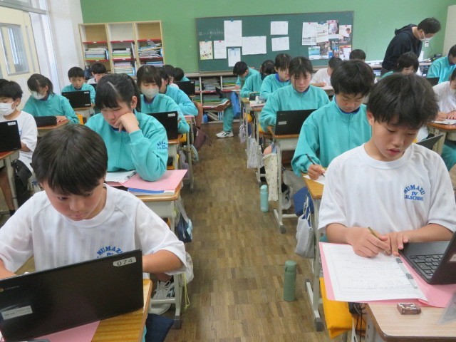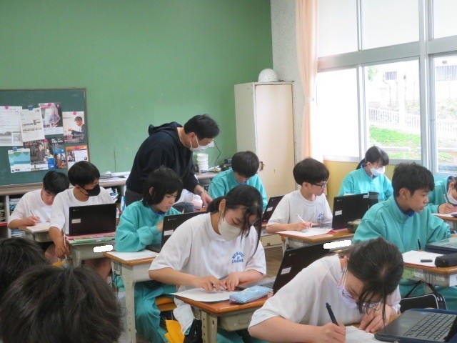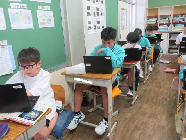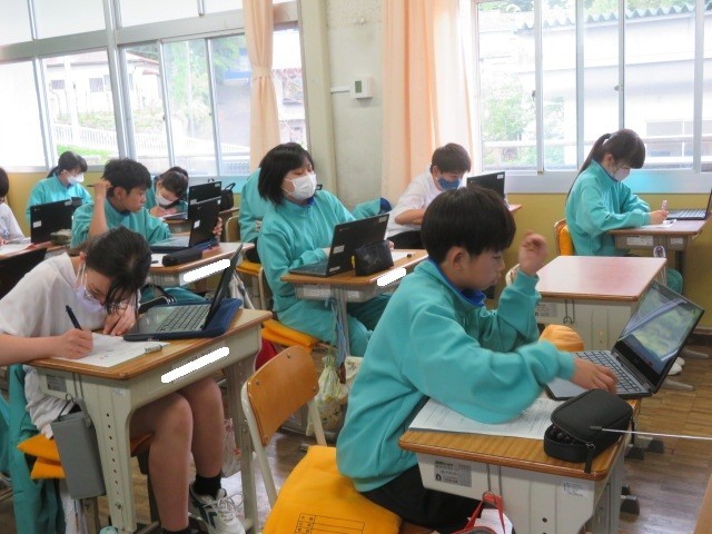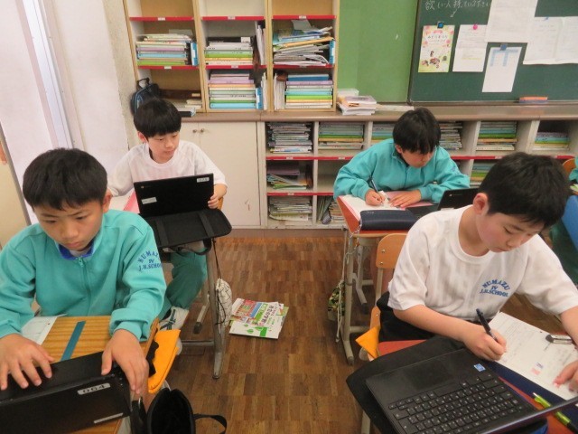 1年A組の社会の時間です。世界の国々について学習をしています。世界の国Quizを作成するために、自分が出題したい国についていろいろ調べています。