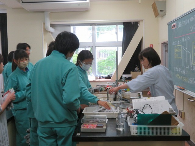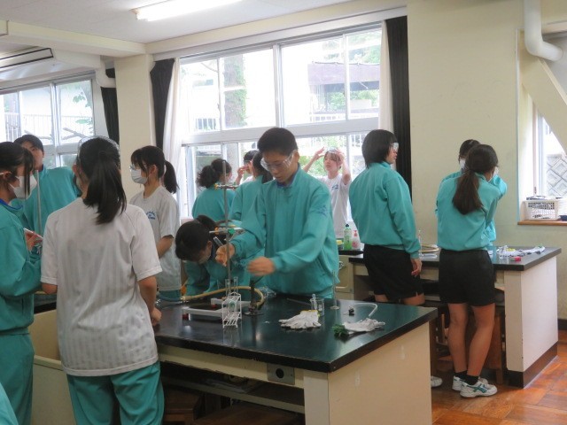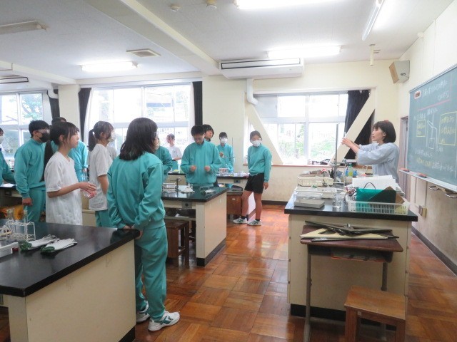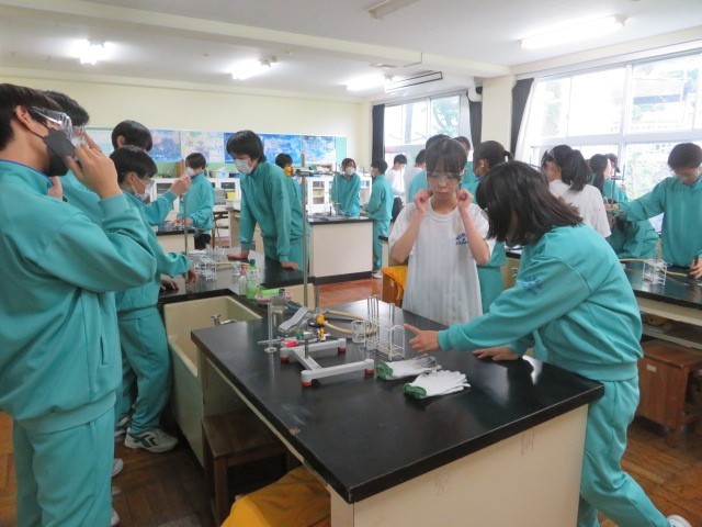 2年A組の理科の時間です。実験の準備を行っています。グループのメンバーそれぞれに割り当てられた器具を準備していきます。