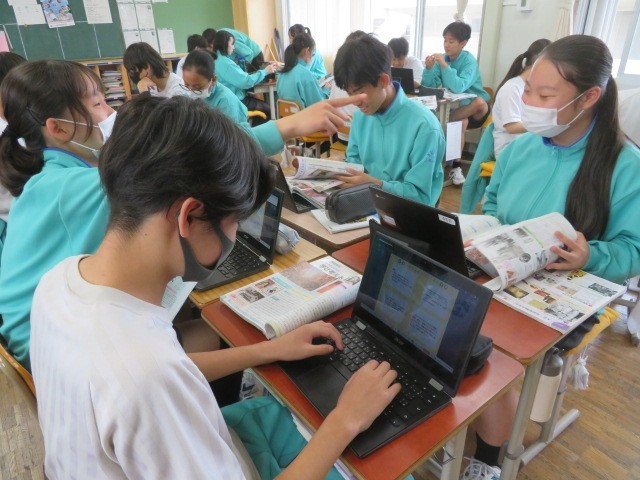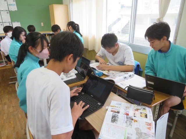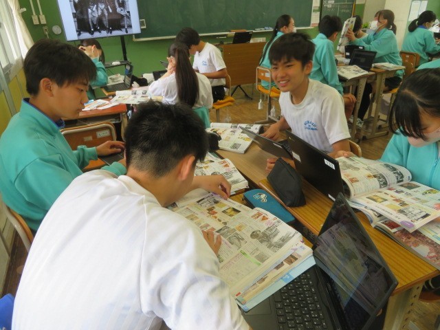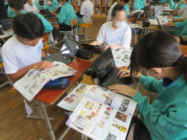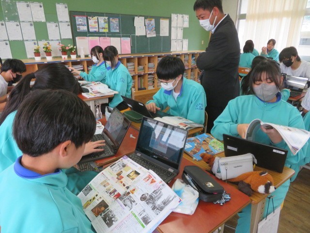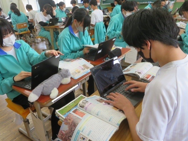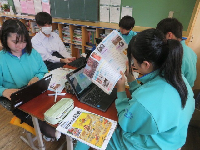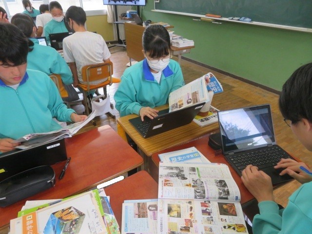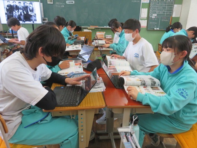 3年B組の社会の時間です。大正時代の文化についての学習です。欧米文化の影響を受けた生活様式、文学、芸術、大衆文化などについて調べています。