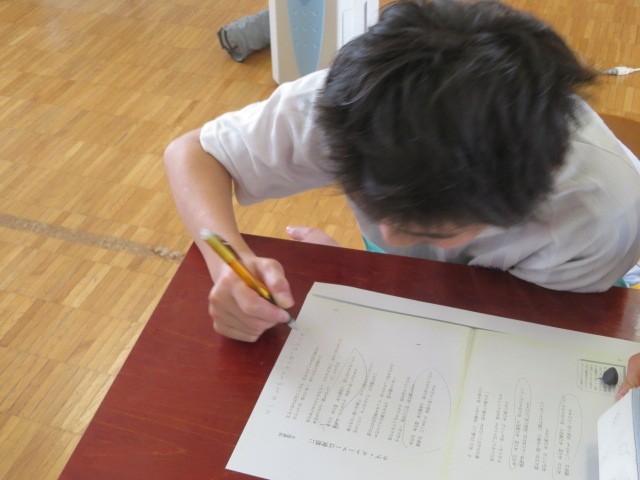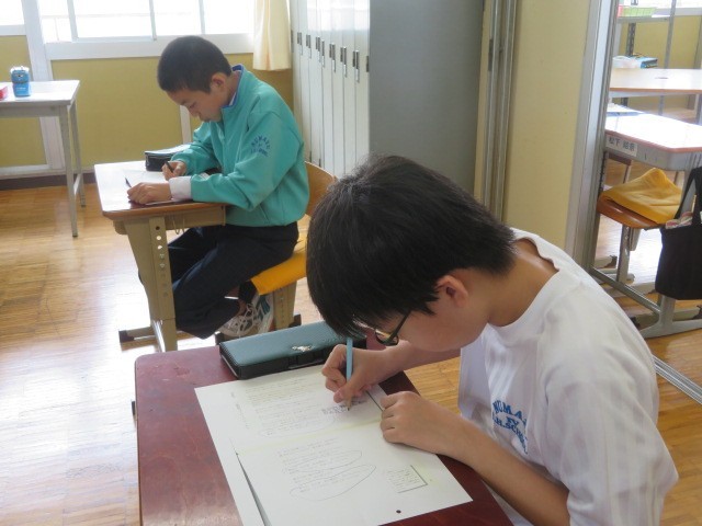E組の国語の時間です。先生が指示をした歌詞の2行分を書き出していました。先生からは、人と人の出会いの大切さについてのお話がありました。