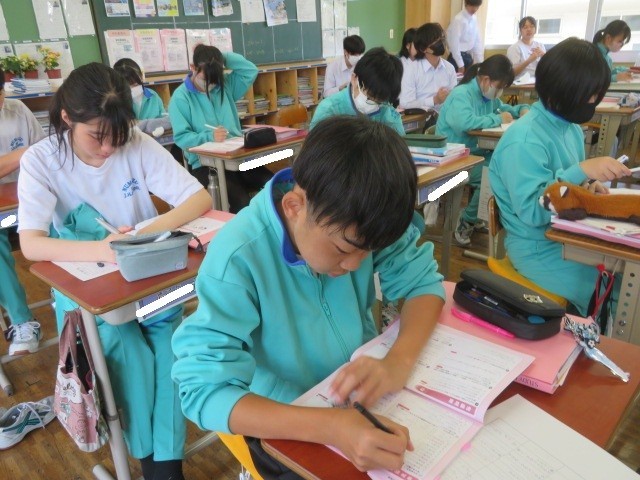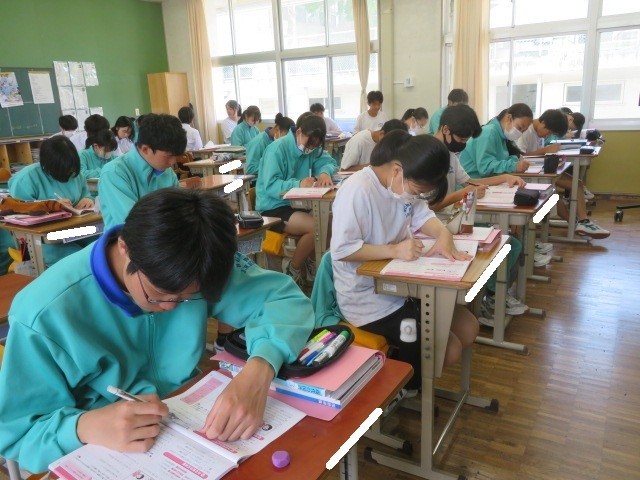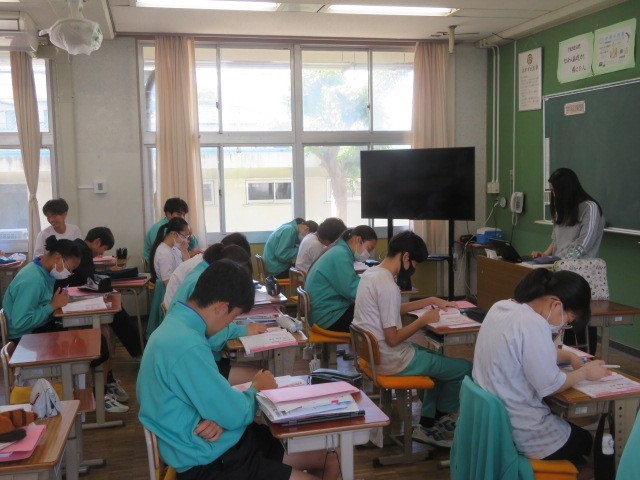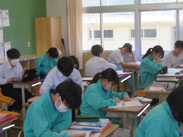 3年B組の国語の時間です。「敬語」について学習しています。使い慣れない言葉も、進路に向けて面談を控える3年生は、正しい使い方を身につけておきたいです。長い人生の中で、ここで学んだことが役立ったと感じるときも来るのではないでしょうか。