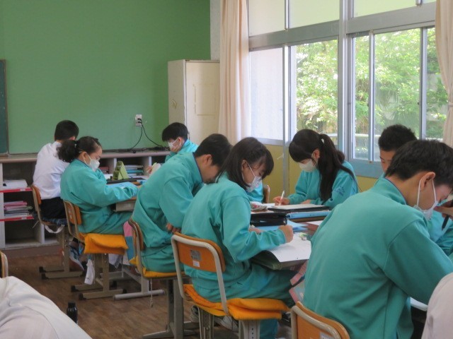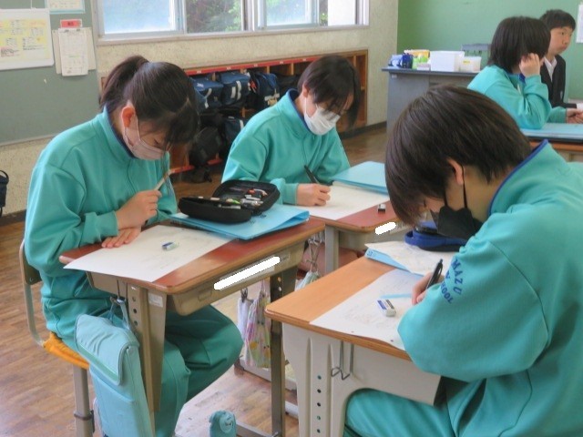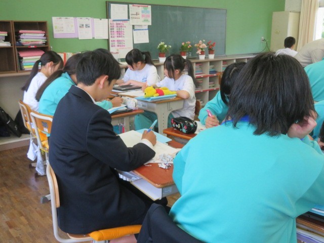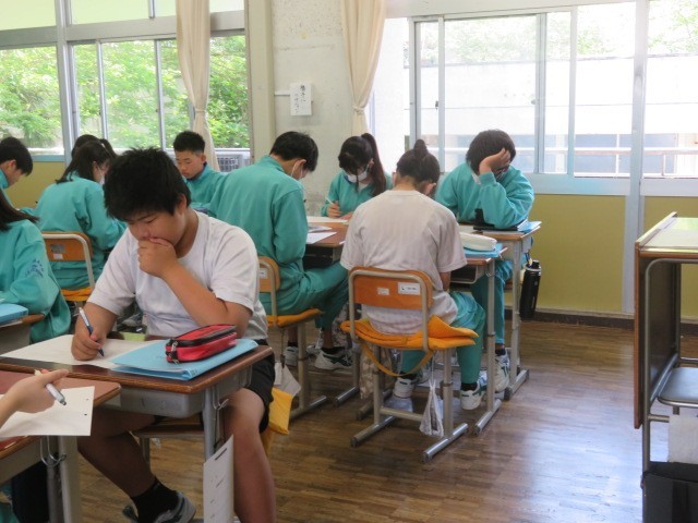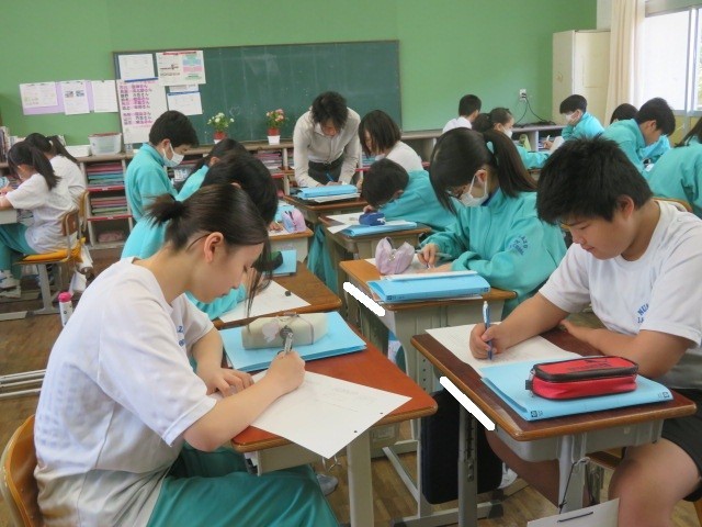 2年A組の数学の時間です。計算だけでなく、数学的に考え、どう整理し説明していくか。深く考えて力を付けていきます。