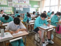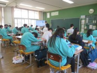 明日はいよいよ公立入試です。3年生は体育館で校長先生から激励の言葉をいただきました。