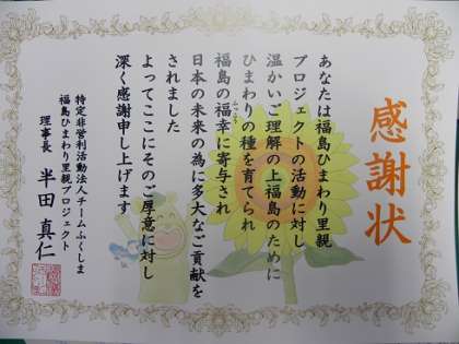 6月に生徒会本部役員が中心となって育ててきたひまわりの種を福島県に贈ったお礼として現地から感謝状が届きました。みなさんの被災地を想う気持ちが届きました。