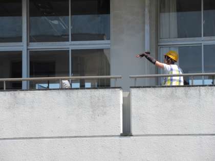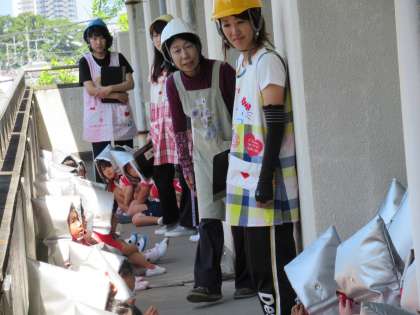 梅花幼稚園の園児たちが、外階段を使って校舎3階への避難訓練を実施しました。静かに整然と避難できています。