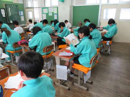 1年生全クラスが同じ時間に、「情報モラルと友情」について、「短文投稿サイトに友達の悪口を書くと」という資料を使い、ネットに関わるときに気を付けなければいけないことを考え、意見交換をしました。写真は、上から1A、1B、1Cの様子です。