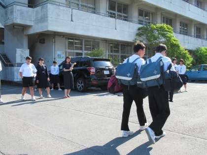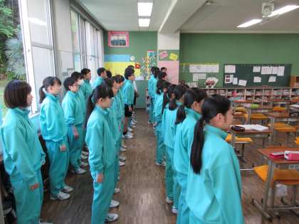 修学旅行用の大きな荷物を事前に送るため、3年生は大きな荷物を持っての登校となりました。明日香村民泊の入村式で披露するため、アカペラの校歌も練習しています。