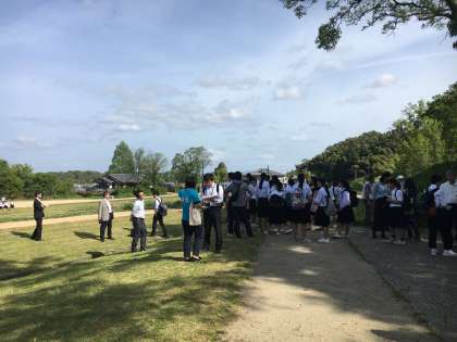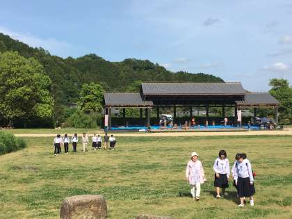 集合場所の石舞台に、ホストファミリーと一緒に続々と集まってきました。