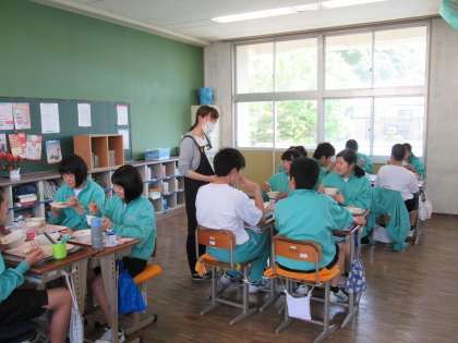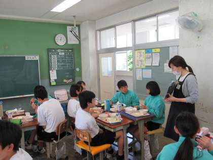 今日は、給食を作っている三中の栄養教諭尾鷲先生が来て説明をしてくれました。