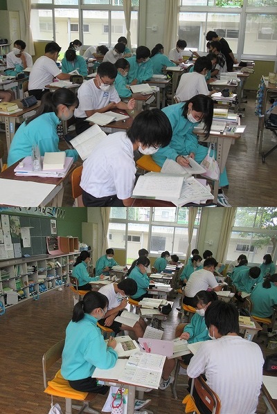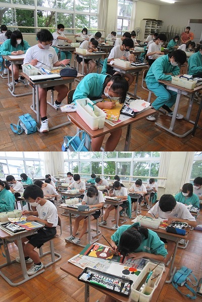 3A…美術 「日本の色」着色に取り組んでいました。今日を入れて、あと2時間で完成です。