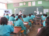 1年B組の英語の時間です。英文での質問に英文で答える問題に挑戦しています。英語...