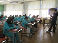 1年A組の英語の時間です。小テストを行っています。一生懸命鉛筆を走らせています...