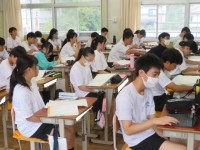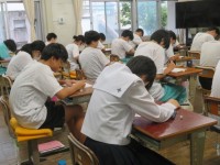 3年A組の国語の時間です。「和歌の世界」の単元テストに取り組んでいます。