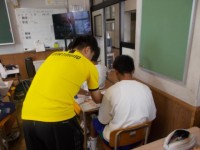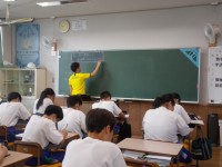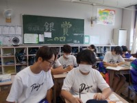 数学の授業です。グラフの情報から交点座標を求める方法を考えています。連立方程式を使うのがポイントのようです。