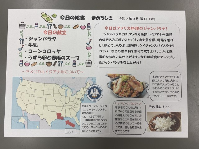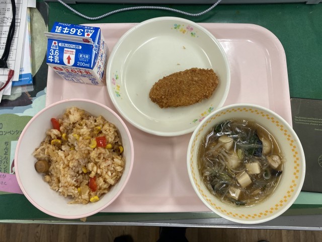 今日の給食は、ジャンバラヤ、コーンコロッケ、うずらの卵と春雨のスープ、牛乳です。